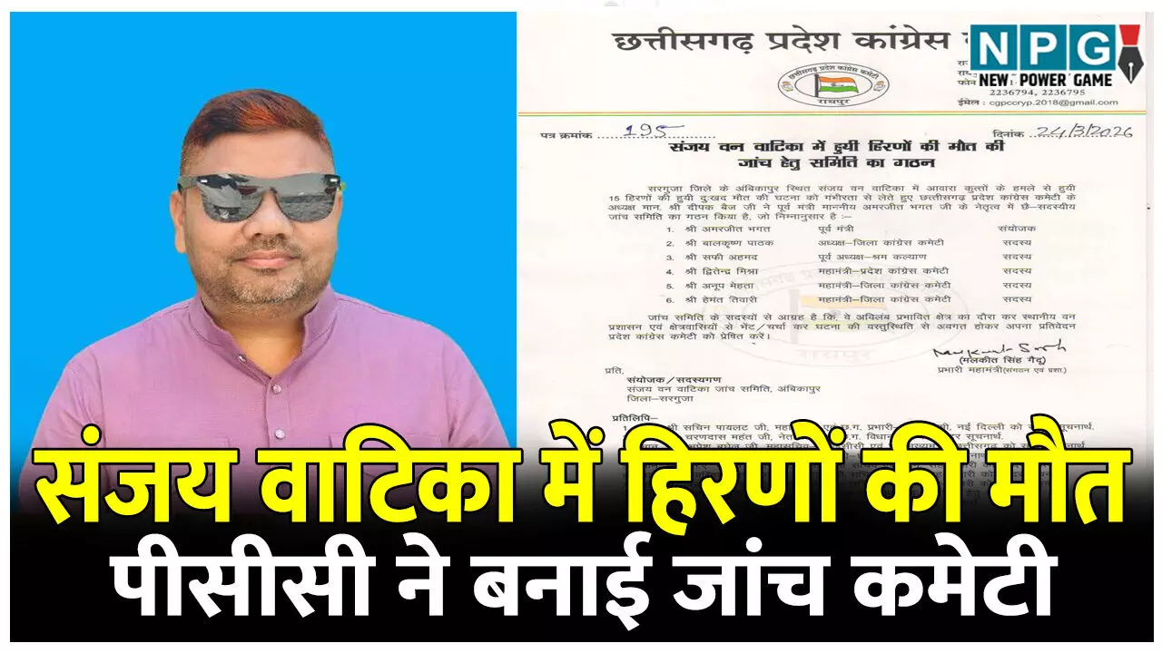 सरगुजा। 25 मार्च 2026| उत्तर छत्तीसगढ़ के अंबिकापुर स्थित संजय वाटिका में 15 हिरणों की मौत के कारणों की जांच के लिए प्रदेश कांग्रेस कमेटी के महामंत्री संगठन व प्रशासन मलकित सिंह गैंदू ने पूर्व मंत्री अमरजीत भगत की अगुवाई में 6 सदस्यीय जांच दल का गठन किया है।