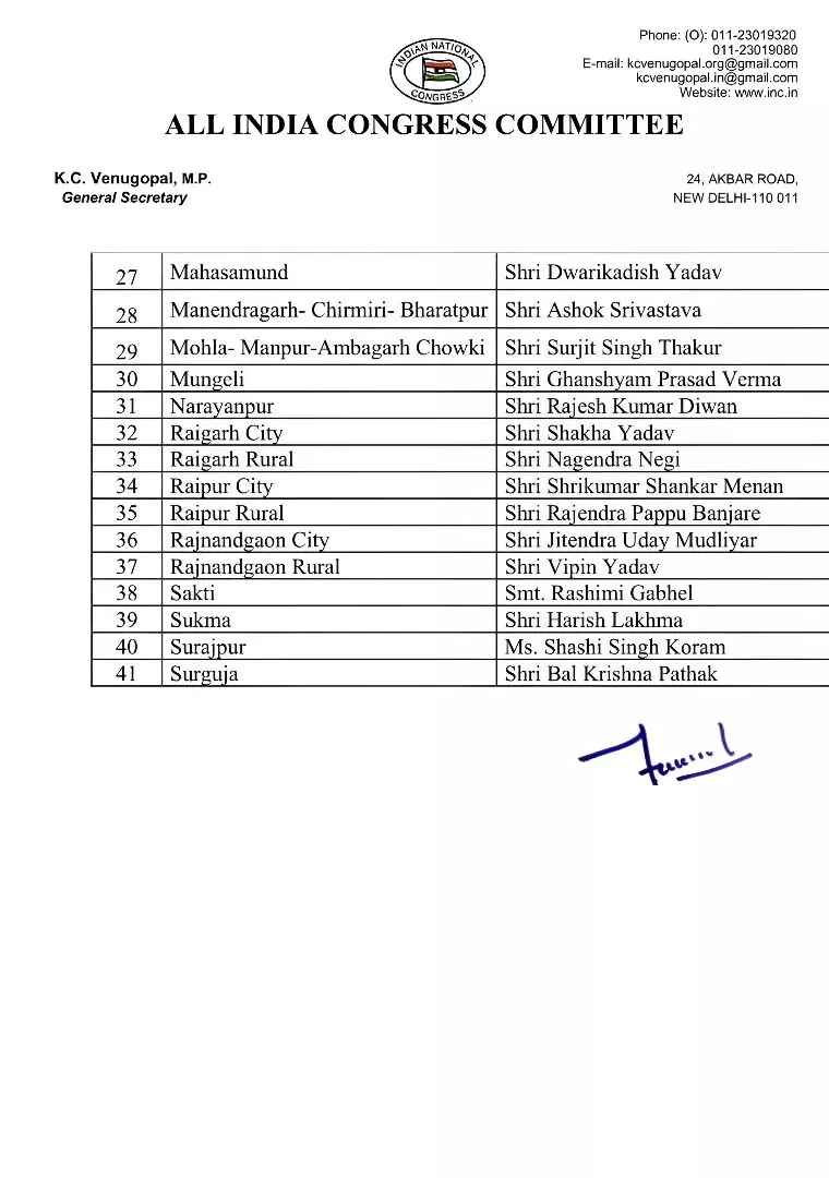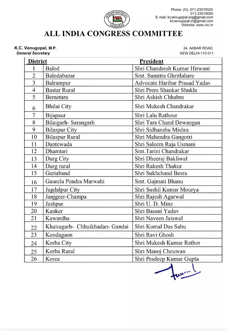 CG Congress politics: कांग्रेस जिला अध्यक्षों की सूची जारी, एआईसीसी महासचिव वेणुगोपाल ने जारी की सूची