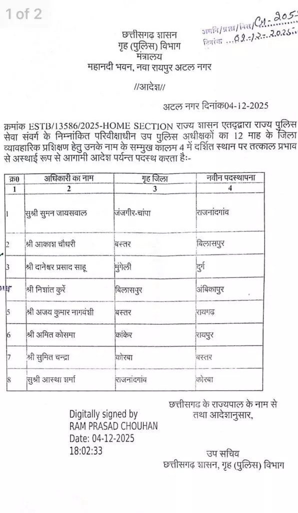 आस्था शर्मा को राजनांगांव से कोरबा भेजा गया है।