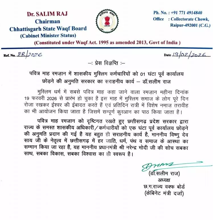 पवित्र माह रमजान को दृष्टिगत रखते हुए छत्तीसगढ़ प्रदेश सरकार द्वारा राज्य के समस्त शासकीय अधिकारी/कर्मचारीयों को एक घंटा पूर्व कार्यालय छोड़ने की अनुमति प्रदान की गई है। यह बहुत ही सराहनीय कार्य है। मुख्यमंत्री विष्णु देव साय के नेतृत्व में छत्तीसगढ़ में हर जाति, धर्म, पंथ व समाज के आस्था का सम्मान किया जा रहा है, यह प्रधानमंत्री नरेन्द्र मोदी की सोच सबका साथ, सबका विकास, सबका विश्वास का ही स्वरूप है।
