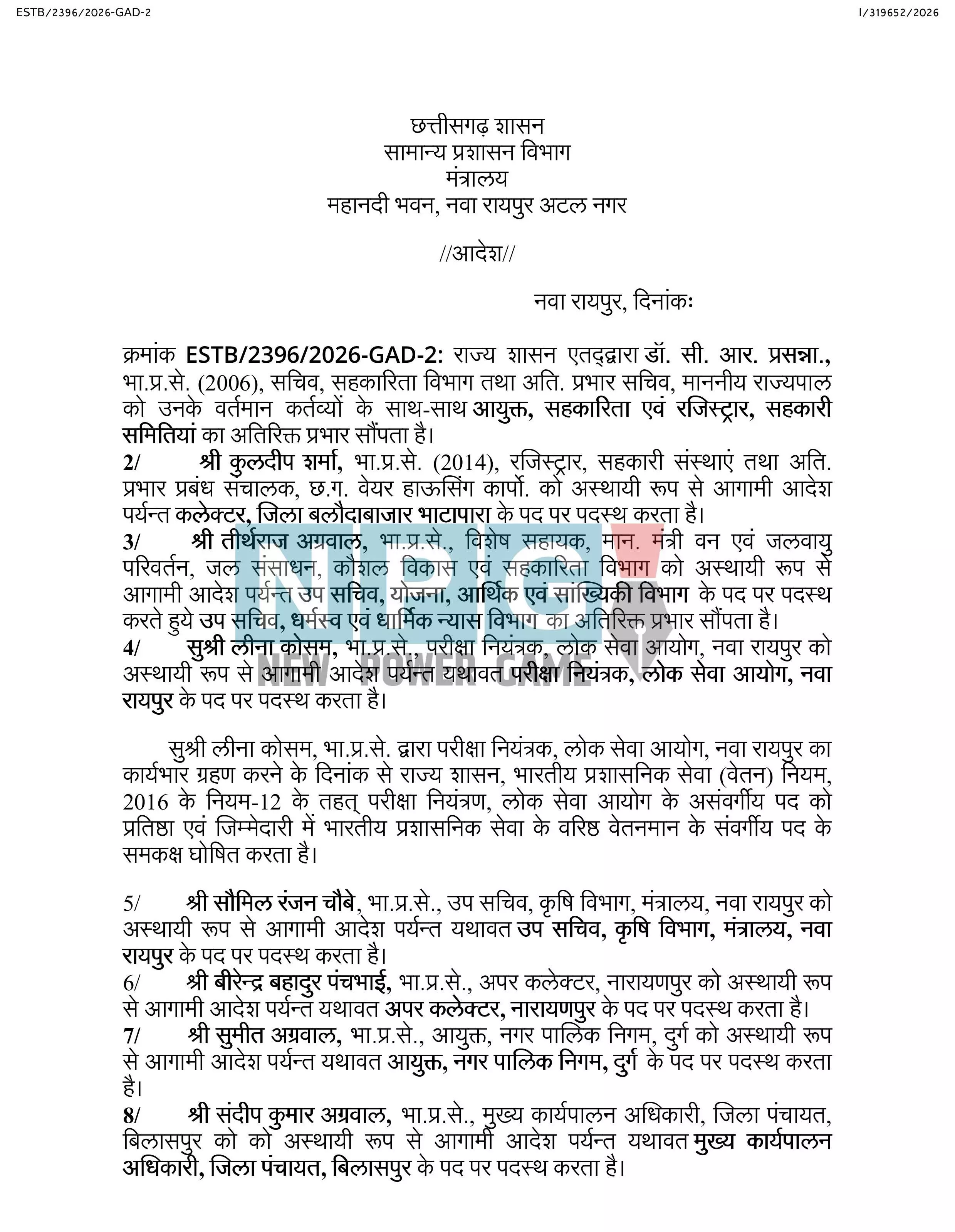 इसी तरह वित्त मंत्री ओपी चौधरी के विशेष सहायक आशीष टिकरिहा एमडी वेयर हाउसिंग के पद पर पदस्थ किया गया है। वहीं सौमिल रंजन चौबे को डिप्टी सिकेट्री कृषि बनाया गया है। देखिए आदेश और किसे कौन सी जिम्मेदारी मिली…