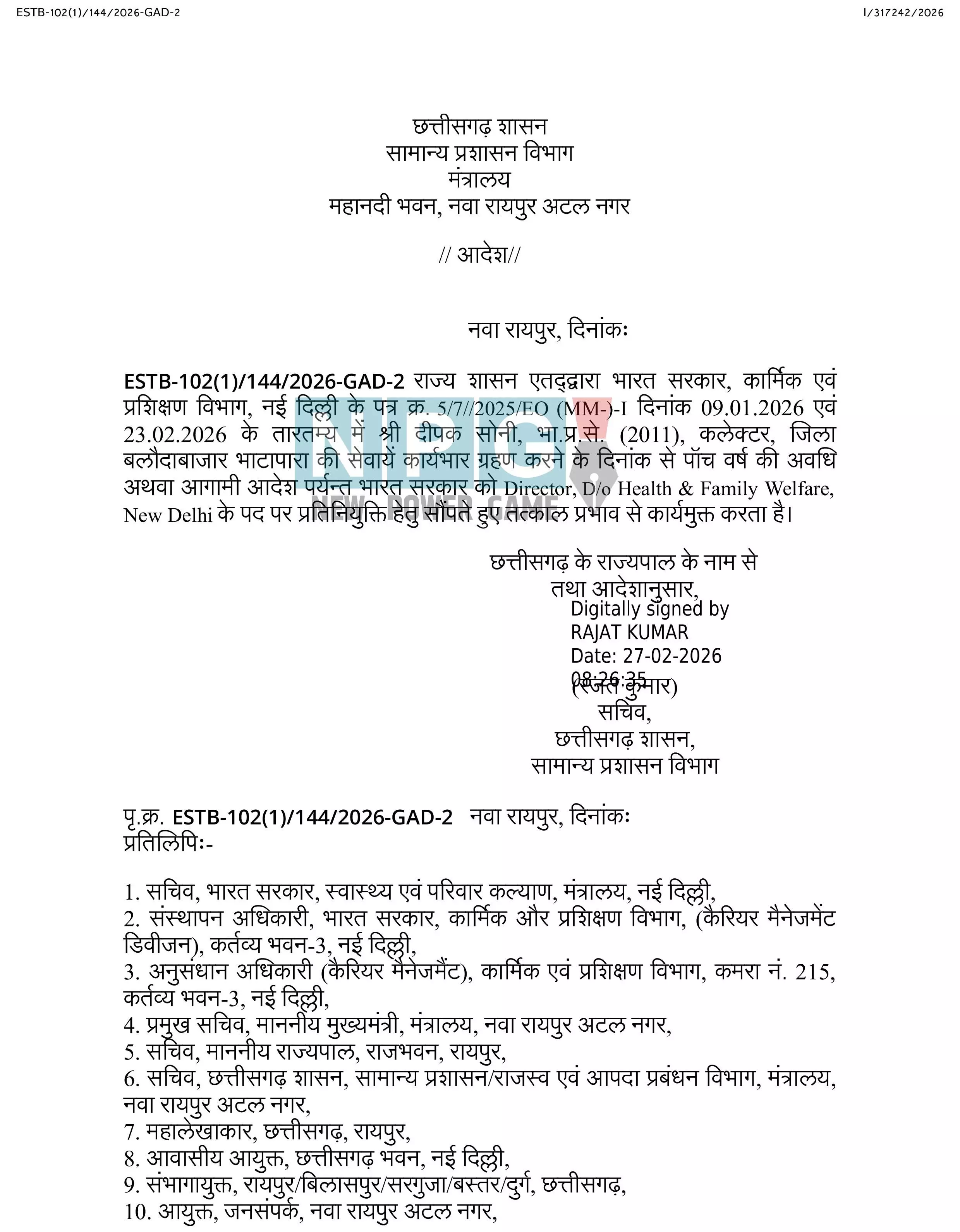 CG IAS Transfer: रायपुर। छत्तीसगढ़ सरकार ने आईएएस अधिकारियों का बहुप्रतीक्षित ट्रांसफर लिस्ट जारी कर दिया है। केंद्रीय प्रतिनियुक्ति पर दिल्ली जा रहे बलौदा बाजार के कलेक्टर दीपक सोनी की जगह पर कुलदीप शर्मा को नया कलेक्टर बनाया गया है। इसके अलावा राज्य प्रशासनिक सेवा से भारतीय प्रशासनिक सेवा के अधिकारी बने नौ अफसरों को भी नई पोस्टिंग दी गई है।