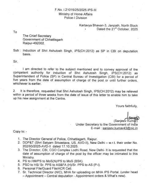 CG IPS News: रायपुर। छत्तीसगढ़ के कैडर के आईपीएस को प्रतिनियुक्ति पर पोस्टिंग देने संबंधी आदेश मिनिस्ट्री ऑफ होम अफेयर्स ने निकाला है। छत्तीसगढ़ कैडर के 2012 बैच के आईपीएस आशुतोष सिंह को डेपुटेशन पर पोस्टिंग दी गई है। जारी आदेश के अनुसार उन्हें सेंट्रल ब्यूरो ऑफ इनविगेस्टकेशन अर्थात सीबीआई में पोस्टिंग मिली है।