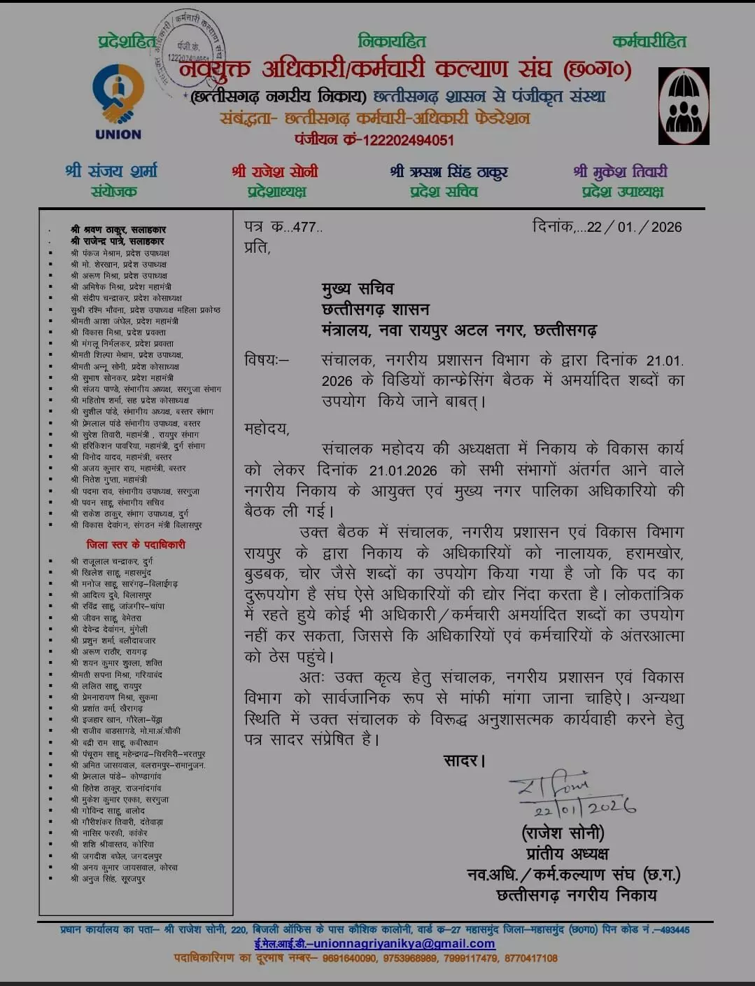 राजेश सोनी प्रांतीय अध्यक्ष नवनियुक्त अधिकारी कर्मचारी कल्याण संघ (छ.ग.) छत्तीसगढ़ नगरीय निकाय ने पत्र मुख्य सचिव को पत्र लिखकर संचालक नगरीय प्रशासन विभाग द्वारा वीसी के दौरान मातहत अधिकारियों के साथ किए गए बदसुलूकी की जानकारी देते हुए संचालक के रवैये पर नाराजगी जताई है। राजेश सोनी ने मुख्य सचिव को पत्र में लिखा है, संचालक की अध्यक्षता में निकाय के विकास कार्य को लेकर 21 जनवरी 2026 को सभी संभागों अंतर्गत आने वाले नगरीय निकाय के आयुक्त एवं मुख्य नगर पालिका अधिकारियों की बैठक ली गई।