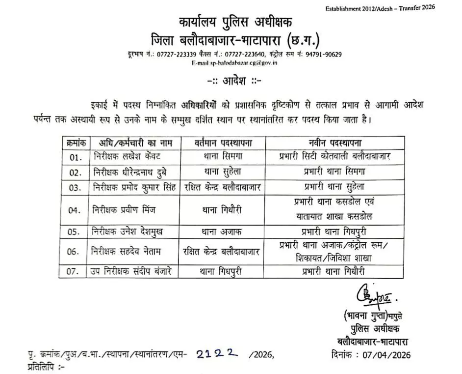 CG Police Transfer: बलौदाबाजार-भाटापारा। छत्तीसगढ़ के बलौदाबाजार-भाटापारा जिले में थानों में पदस्थ थाना प्रभारियों, सब इंस्पेक्टर को इधर से उधर किया गया है। सूची में 6 निरीक्षक, 1 सब इंस्पेक्टर का नाम शामिल है। वहीँ एक थाना प्रभारी को थाने के साथ साथ यातायात का प्रभार भी सौंपा गया है। यह सूची एसपी भावना गुप्ता ने जारी किया है।