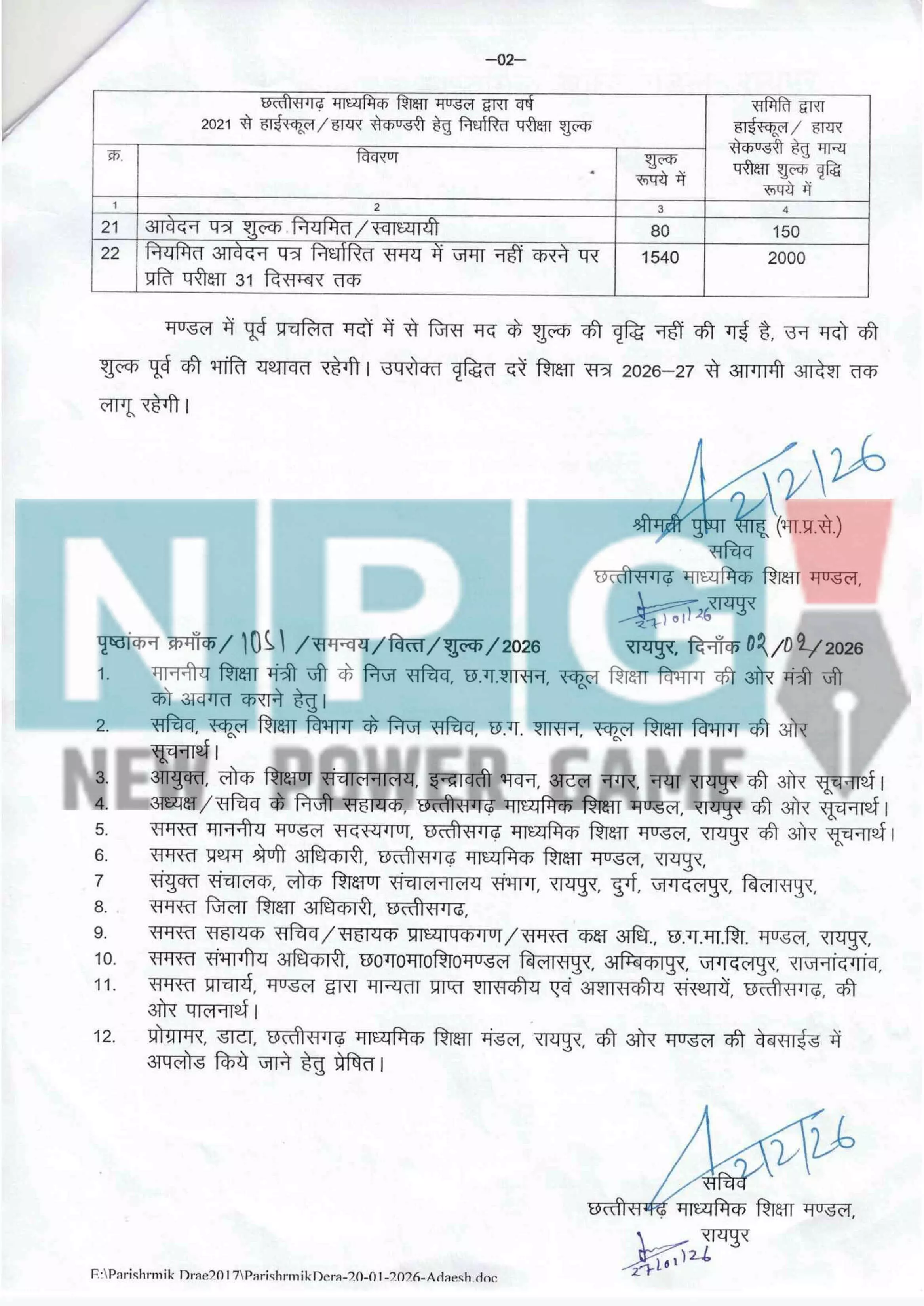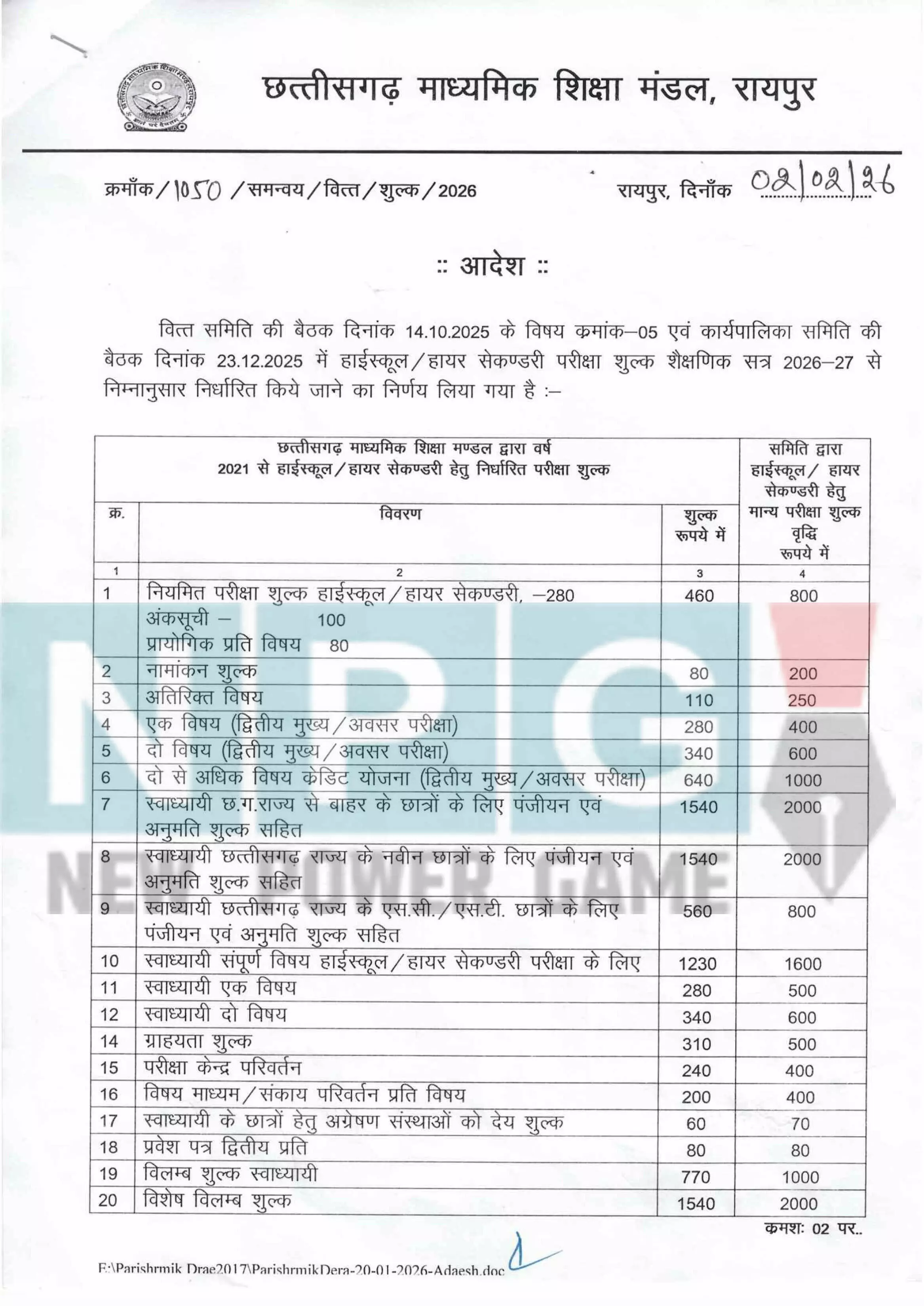 06 फरवरी 2026|रायपुर। छत्तीसगढ़ माध्यमिक शिक्षा मंडल की सचिव पुष्पा साह साहू ने एक आदेश जारी कर हाई व हायर सेकेंडरी स्कूल परीक्षा फीस में बढ़ोतरी का आदेश जारी किया है। जारी आदेश में माशिमं सचिव ने वित्त समिति की बैठक का हवाला देते हुए लिखा है कि समिति की 14 अक्टूबर 2025 एवं कार्यपालिका समिति की बैठक 23 दिसंबर 2025 में हाईस्कूल / हायर सेकण्डरी परीक्षा शुल्क शैक्षणिक सत्र 2026-27 से फीस में वृद्धि करने का निर्णय लिया है।