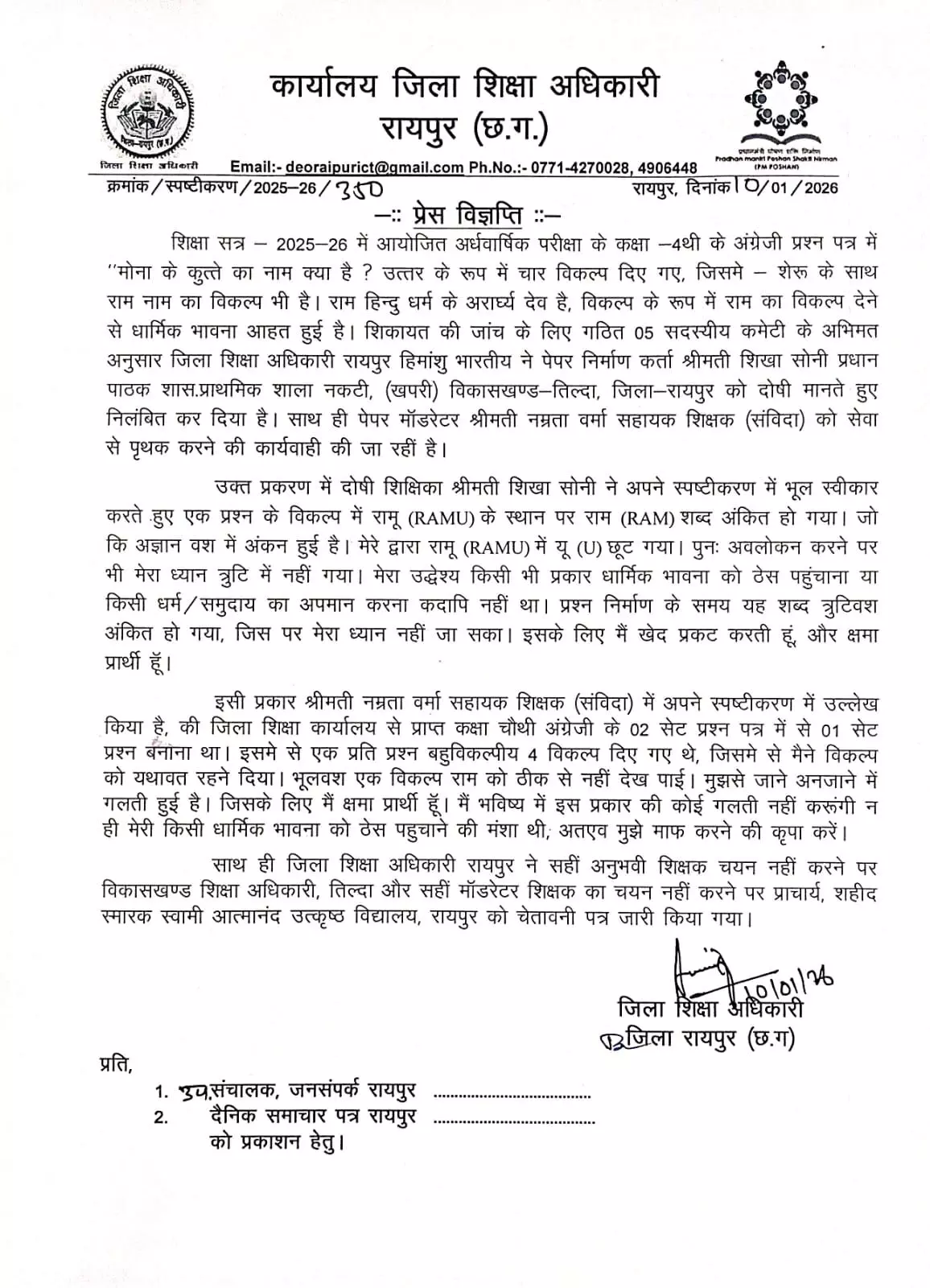 ”शिक्षा सत्र 2025-26 में आयोजित अर्धवार्षिक परीक्षा के कक्षा 4थी के अंग्रेजी प्रश्न पत्र में “मोना के कुत्ते का नाम क्या है? उत्तर के रूप में चार विकल्प दिए गए, जिसमे शेरू के साथ राम नाम का विकल्प भी है। राम हिन्दु धर्म के अरार्ध्य देव है, विकल्प के रूप में राम का विकल्प देने से धार्मिक भावना आहत हुई है। शिकायत की जांच के लिए गठित 05 सदस्यीय कमेटी के अभिमत अनुसार जिला शिक्षा अधिकारी रायपुर हिमांशु भारतीय ने पेपर निर्माण कर्ता शिखा सोनी प्रधान पाठक शास. प्राथमिक शाला नकटी, (खपरी) विकासखण्ड-तिल्दा, जिला-रायपुर को दोषी मानते हुए निलंबित कर दिया है। साथ ही पेपर मॉडरेटर नम्रता वर्मा सहायक शिक्षक (संविदा) को सेवा से पृथक करने की कार्यवाही की जा रहीं है।