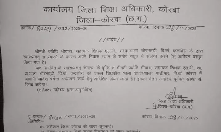 दरअसल महिला शिक्षिका ज्योति श्रीवास जो कि सहायक शिक्षक के पद पर कटघोरा विकासखंड के शासकीय प्राथमिक शाला चोरभट्टी में पदस्थ थी उसे जिला शिक्षा अधिकारी ने 28 नवंबर को आदेश जारी कर विकासखंड कोरबा जो कि शहरी इलाका है के शासकीय प्राथमिक शाला पाड़ीगार में पदस्थ कर दिया है और जारी आदेश के अनुसार कलेक्टर ने इसका अनुमोदन भी किया है।