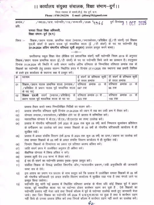 CG Teacher Promotion: दुर्ग। छत्तीसगढ़ के दुर्ग संभाग के शिक्षकों के लिए अच्छी खबर है। संयुक्त संचालक शिक्षा संभाग दुर्ग ने सभी जिला शिक्षा अधिकारियों को पदोन्नति हेतु प्रस्ताव प्रस्तुत करने को कहा है।