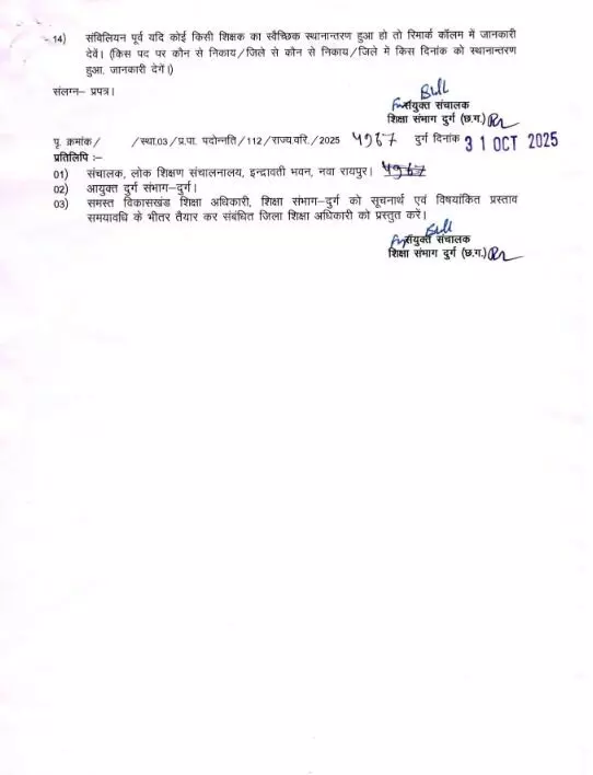 13) पदोन्नति हेतु मांगी गई प्रस्ताव में निर्धारित वरिष्ठता क्रमांक के भीतर यदि कोई शिक्षक पूर्व में प्रधान पाठक, पूर्व माध्यमिक शाला पद पर पदोन्नत होकर कार्यभार ग्रहण कर चुके हैं ऐसे शिक्षकों का पदोन्नति प्रस्ताव नहीं भेजा जाये तथा रिमार्क कॉलम में पूर्व से पदोन्नत उल्लेख करते हुए जानकारी भेजा जावे। तथा जिन शिक्षक का पदोन्नति वर्ष 2024 में प्र.पा.पू.मा.शा.पद पर हुआ है तथा वे कार्यभार ग्रहण नहीं किये हो उनका प्रस्ताव प्रेषित करें तथा रिमार्क कॉलम में कार्यभार ग्रहण नहीं करने का उल्लेख करें।