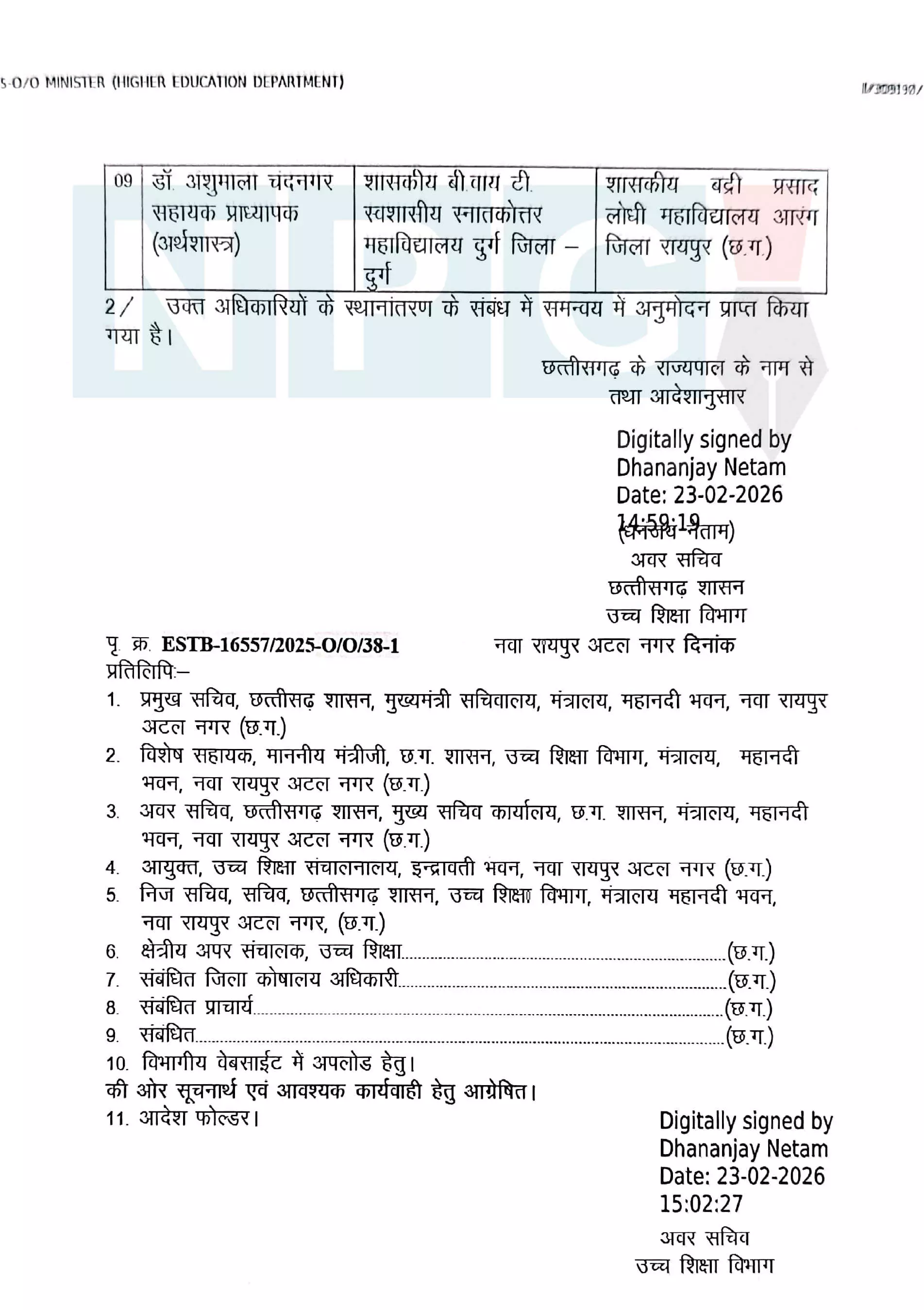 CG Transfer News: छत्तीसगढ़ में सहायक प्राध्यापकों और प्राध्यापकों के तबादले, देखिये आदेश… admin February 23, 2026 0 छतीसगढ़ Share CG Transfer News: रायपुर। छत्तीसगढ़ प्राचार्य एवं सहायक प्राध्यापकों की ट्रांसफर सूची जारी की गई है। लिस्ट में 9 के नाम शामिल है। नीचे देखें पूरी सूची… Share