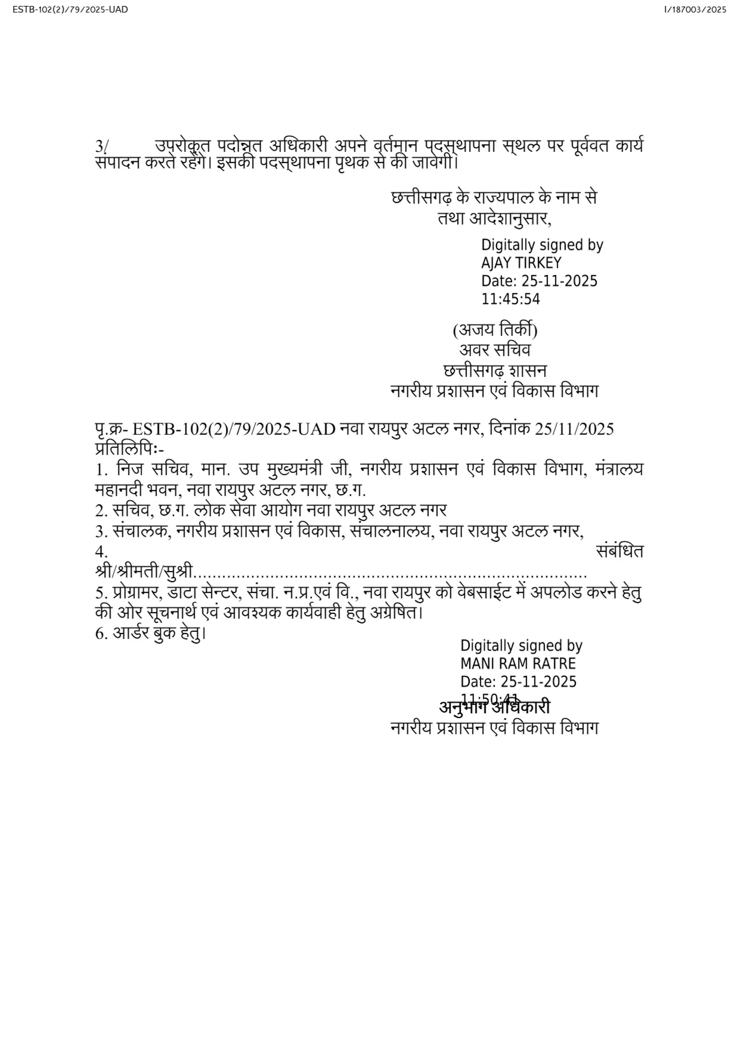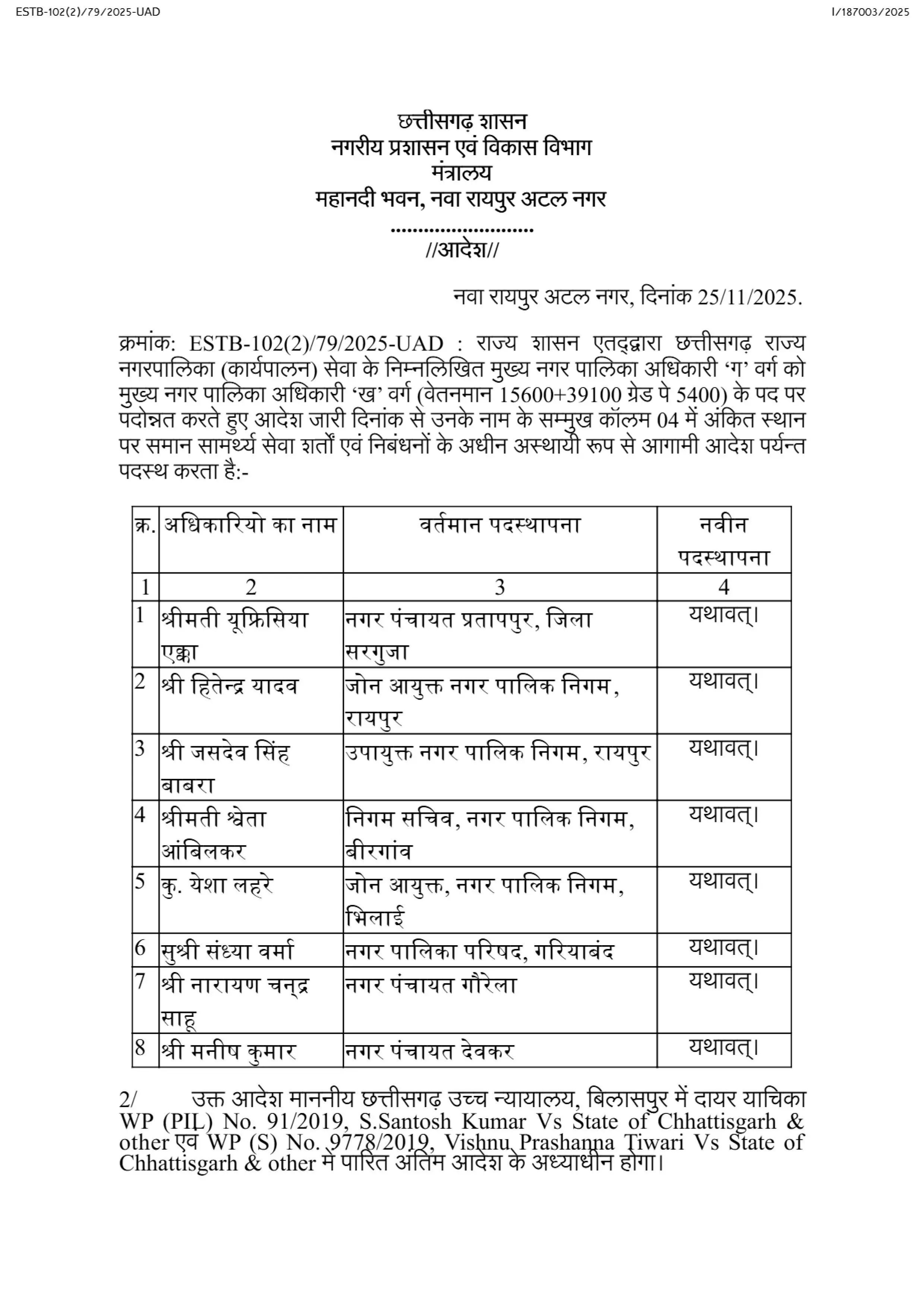 हितेन्द्र यादव जोन आयुक्त नगर पालिक निगम, रायपुर-यथावत्।