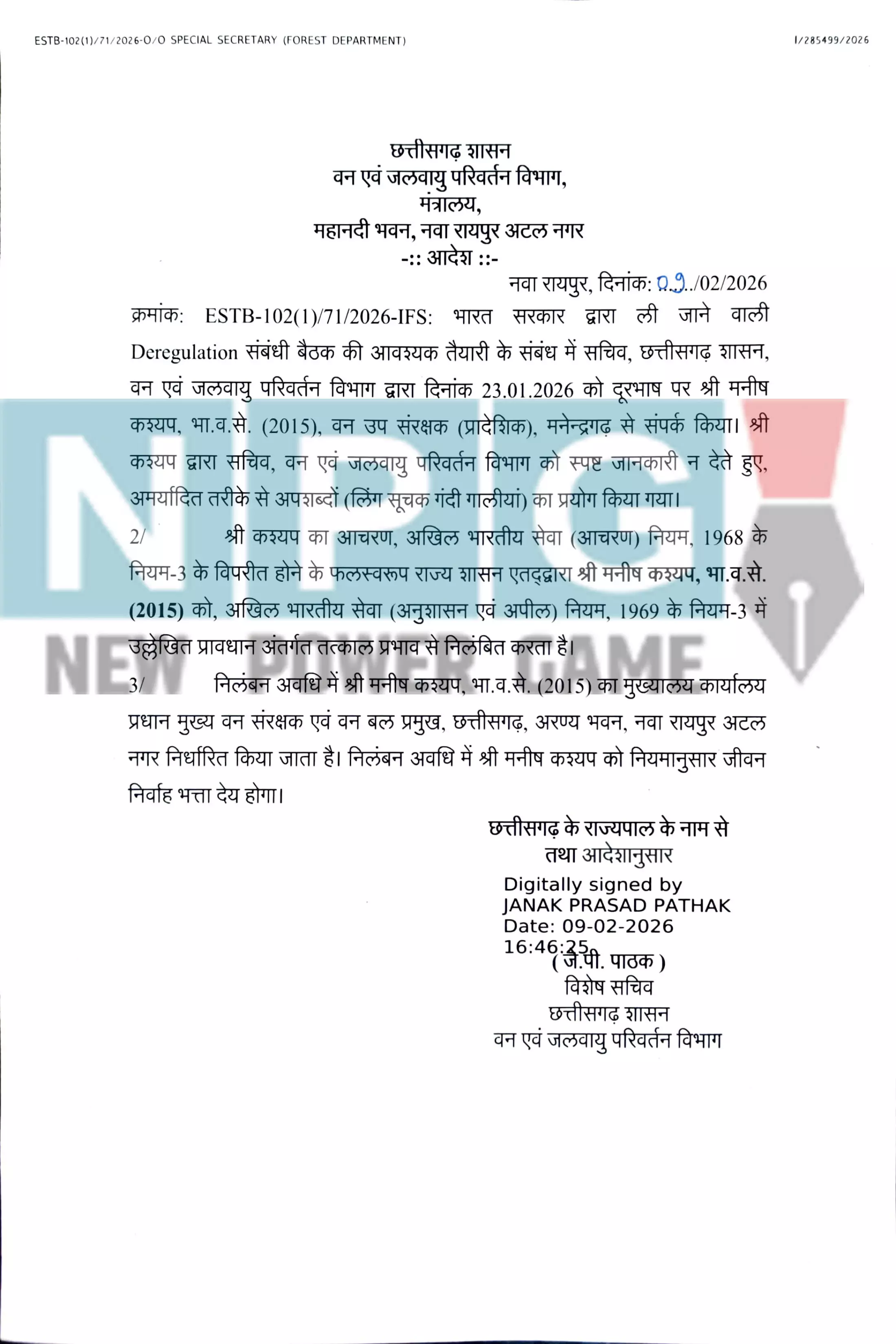 राज्य सरकार ने उनकी जगह चंद्र कमार अग्रवाल को मनेंद्रगढ़ का नया डीएफओ नियुक्त कर दिया है। सबसे पहले वन विभाग ने सिंगल आदेश निकालकर नए डीएफओ की नियुक्ति की। उस आदेश में मनीष कश्यप का कोई जिक्र नहीं था कि उन्हें कहां भेजा जा रहा। तभी वन महकमे के अधिकारियों का माथा ठनका था। इसके कुछ देर बार वन विभाग के सचिव जनक पाठक का आदेश आ गया। उसमें मनीष कश्यप को सस्पेंड कर दिया गया।