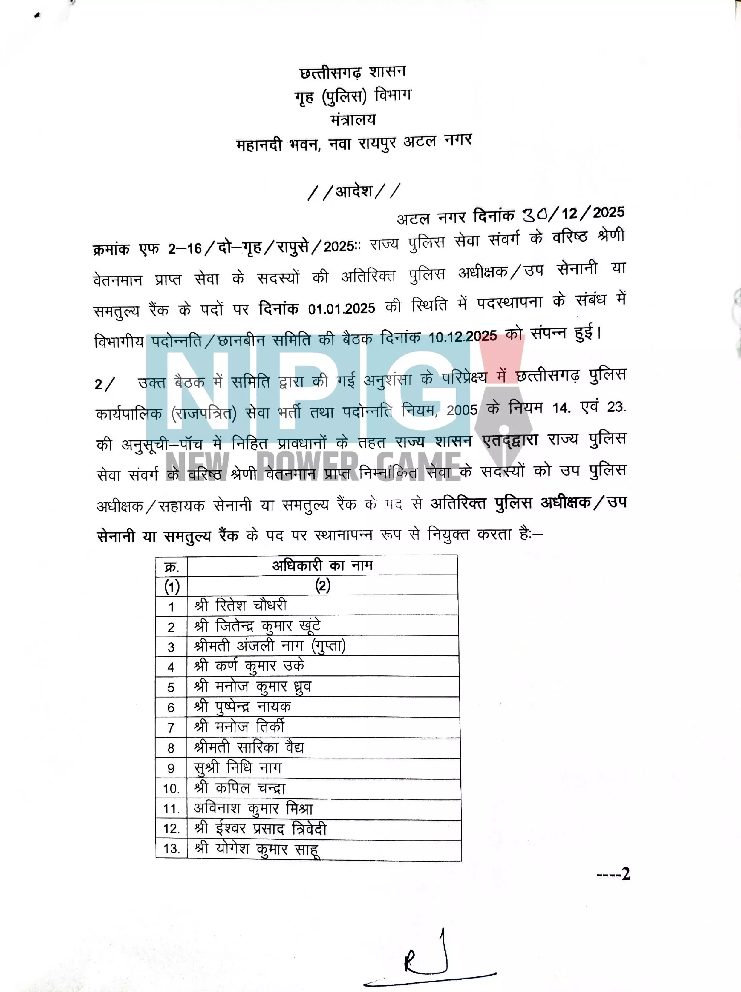 बैठक में समिति द्वारा की गई अनुशंसा के परिप्रेक्ष्य में छत्तीसगढ़ पुलिस कार्यपालिक (राजपत्रित) सेवा भर्ती तथा पदोन्नति नियम, 2005 के नियम 14. व 23 की अनुसूची-पॉच में निहित प्रावधानों के तहत राज्य शासन एतद्वारा राज्य पुलिस सेवा संवर्ग के वरिष्ठ श्रेणी वेतनमान प्राप्त निम्नांकित सेवा के सदस्यों को उप पुलिस अधीक्षक से अतिरिक्त पुलिस अधीक्षक के पद पर पदोन्नत किया गया है…