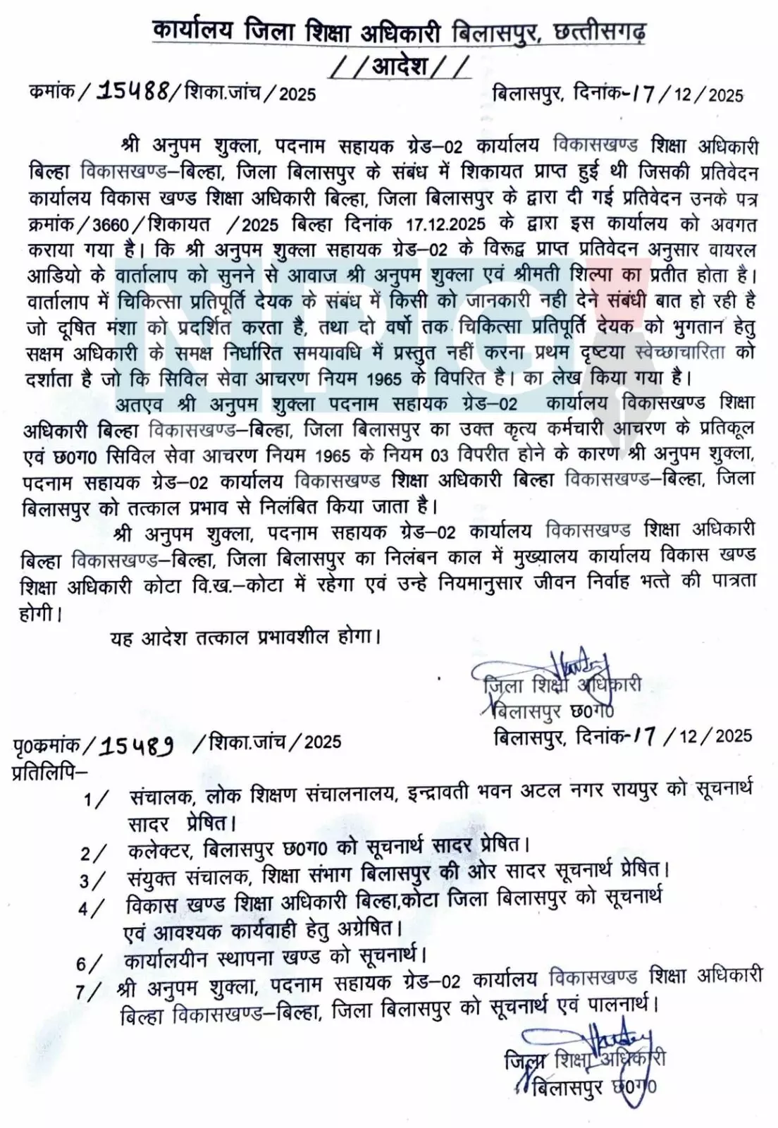 CG Education News: डीईओ ने जारी निलंबन आदेश में लिखा है, अनुपम शुक्ला, पदनाम सहायक ग्रेड-02 कार्यालय विकासखण्ड शिक्षा अधिकारी बिल्हा विकासखण्ड-बिल्हा, जिला बिलासपुर के संबंध में शिकायत प्राप्त हुई थी जिसकी प्रतिवेदन कार्यालय विकास खण्ड शिक्षा अधिकारी बिल्हा, जिला बिलासपुर के द्वारा दी गई प्रतिवेदन के द्वारा इस कार्यालय को अवगत कराया गया है। कि अनुपम शुक्ला सहायक ग्रेड-02 के विरूद्ध प्राप्त प्रतिवेदन अनुसार वायरल आडियो के वार्तालाप को सुनने से आवाज अनुपम शुक्ला एवं शिल्पा का प्रतीत होता है। वार्तालाप में चिकित्सा प्रतिपूर्ति देयक के संबंध में किसी को जानकारी नही देने संबंधी बात हो रही है जो दूषित मंशा को प्रदर्शित करता है, तथा दो वर्षों तक चिकित्सा प्रतिपूर्ति देयक को भुगतान हेतु सक्षम अधिकारी के समक्ष निर्धारित समयावधि में प्रस्तुत नहीं करना प्रथम दृष्टया स्वेच्छाचारिता को दर्शाता है जो कि सिविल सेवा आचरण नियम 1965 के विपरित है। का लेख किया गया है।