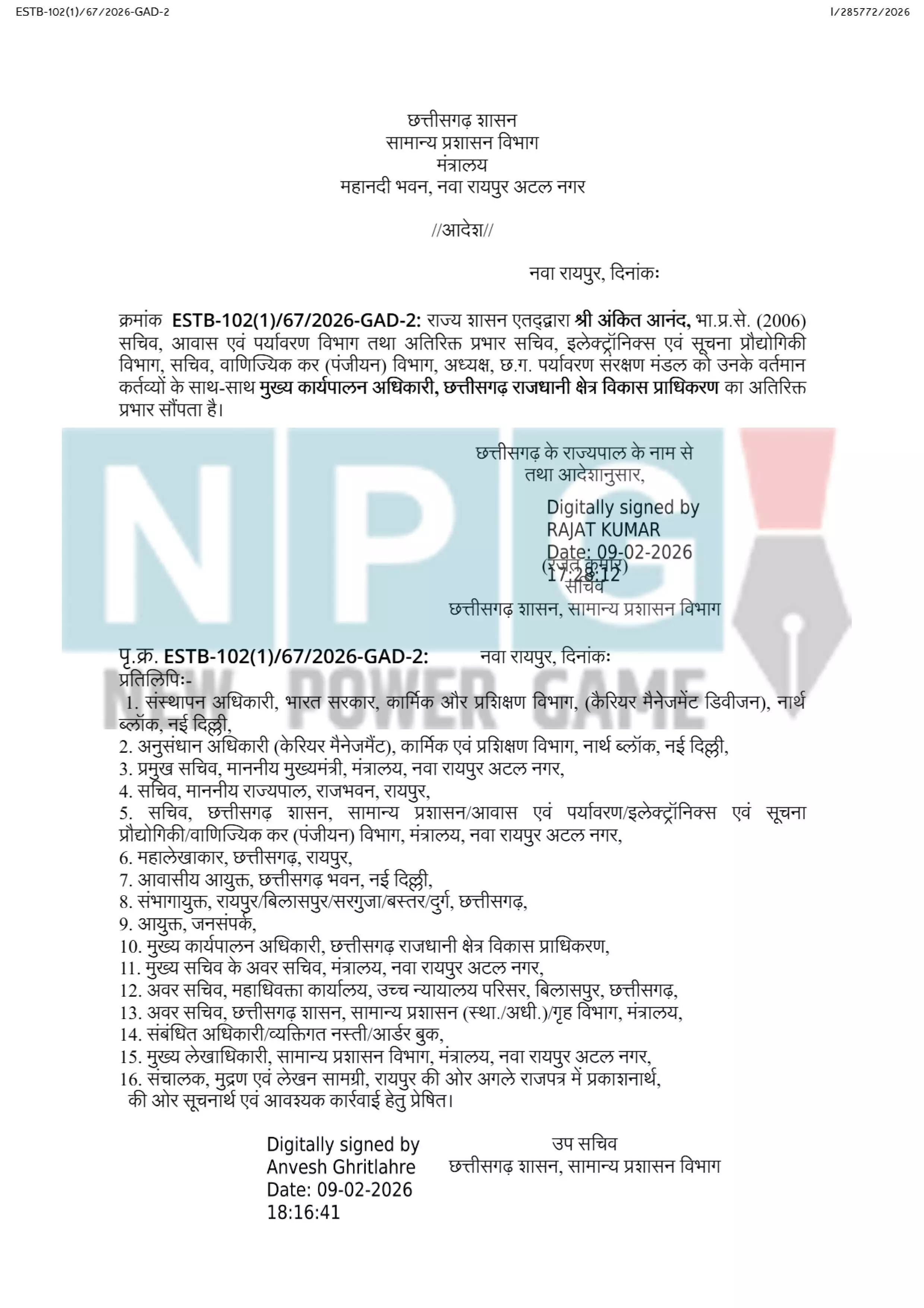 10 February 2026|रायपुर। छत्तीसगढ़ सरकार ने छत्तीसगढ़ राजधानी विकास प्राधिकरण की दिशा में एक कदम आगे बढते हुए सीईओ की नियुक्ति कर दी है। सचिव स्तर के अधिकारी अंकित आनंद को आज इस प्राधिकरण में बतौर सीईओ पोस्ट किया गया है। अंकित की यह अतिरिक्त जिम्मेदारी होगी। वे आवास और पर्यावरण, इलेक्ट्रॉनिक, सूचना प्रौद्योगिकी तथा पंजीयन विभाग के सचिव के साथ छत्तीसगढ़ पॉल्यूशन बोर्ड के अध्यक्ष बने रहेंगे।